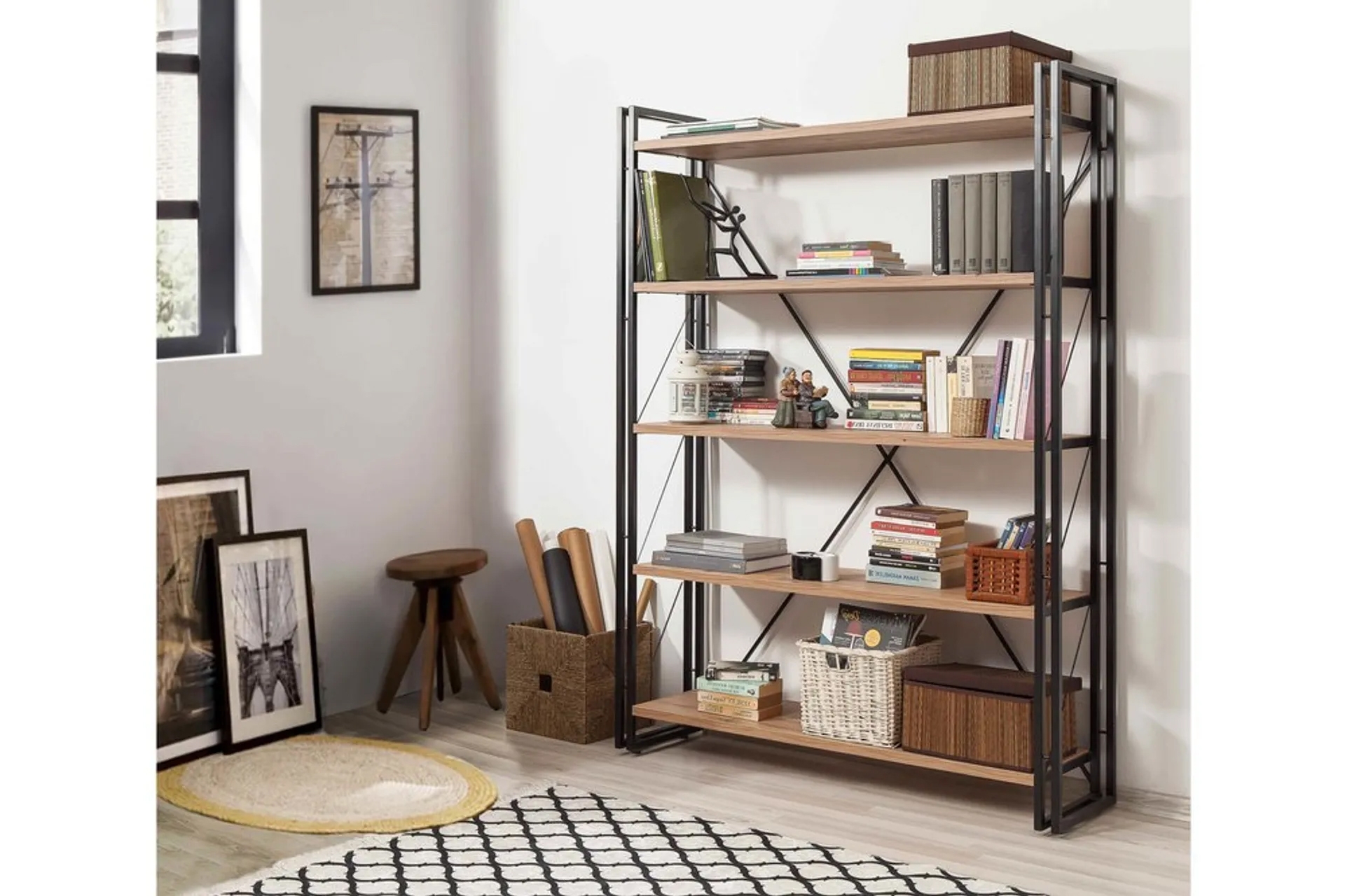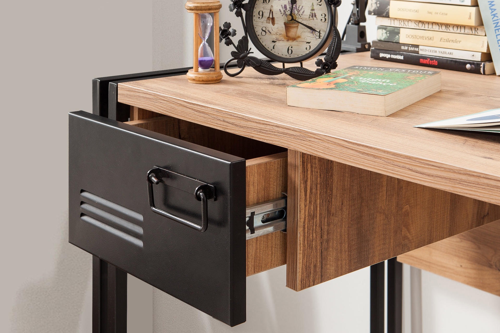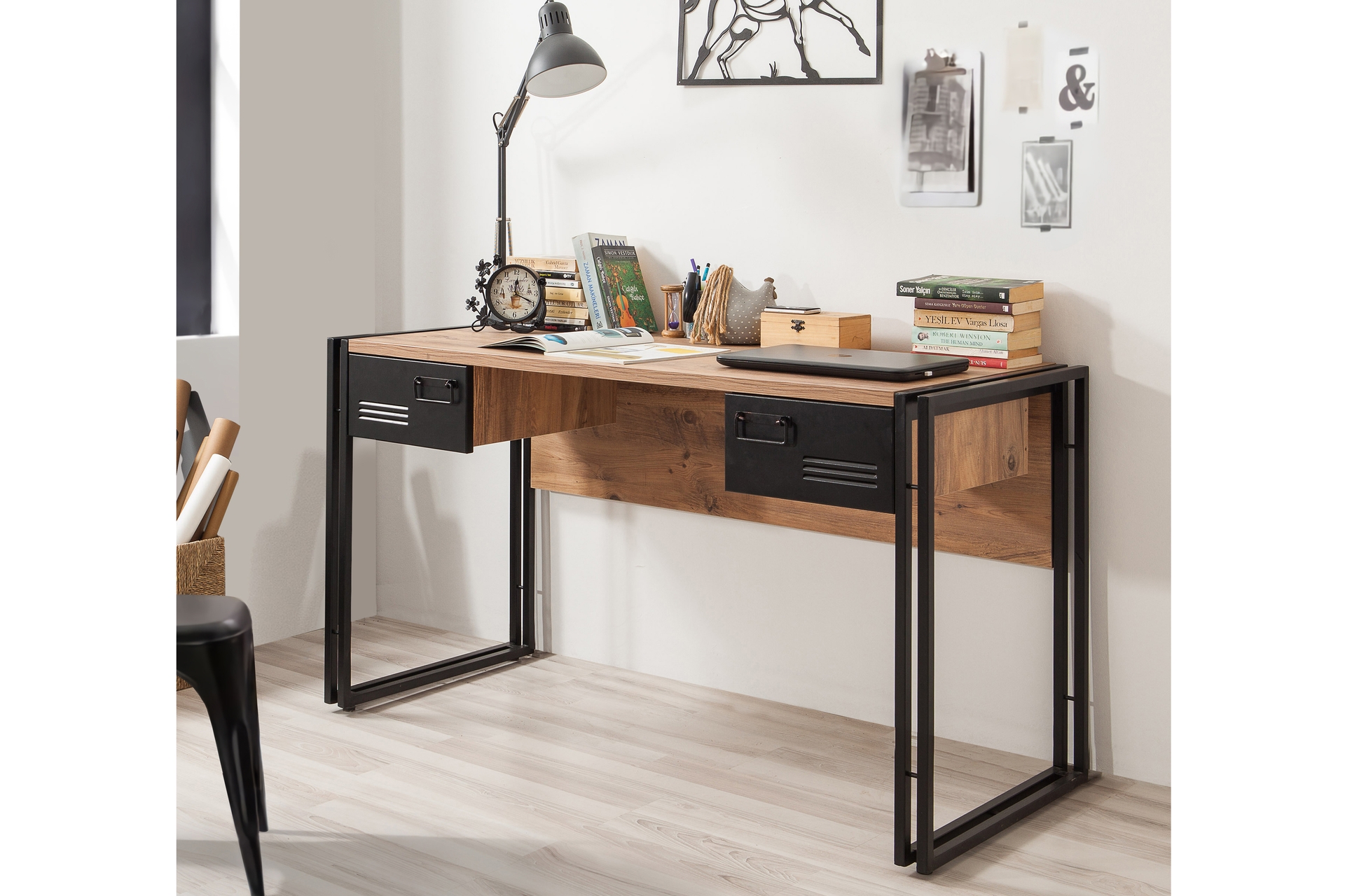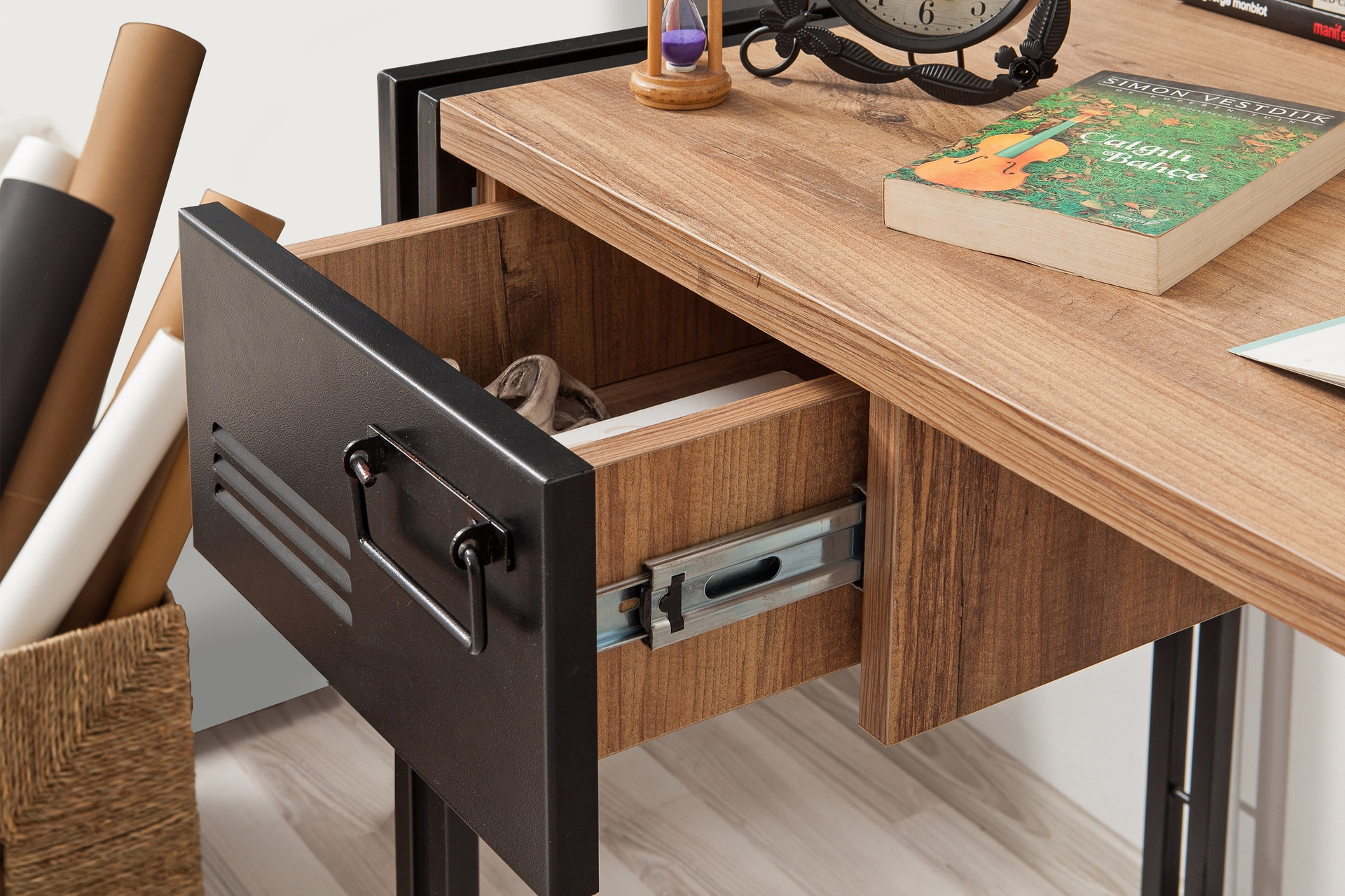 Tasarım: Ahşap dokusu ile siyah metalin birleştiği endüstriyel/modern tarz.
