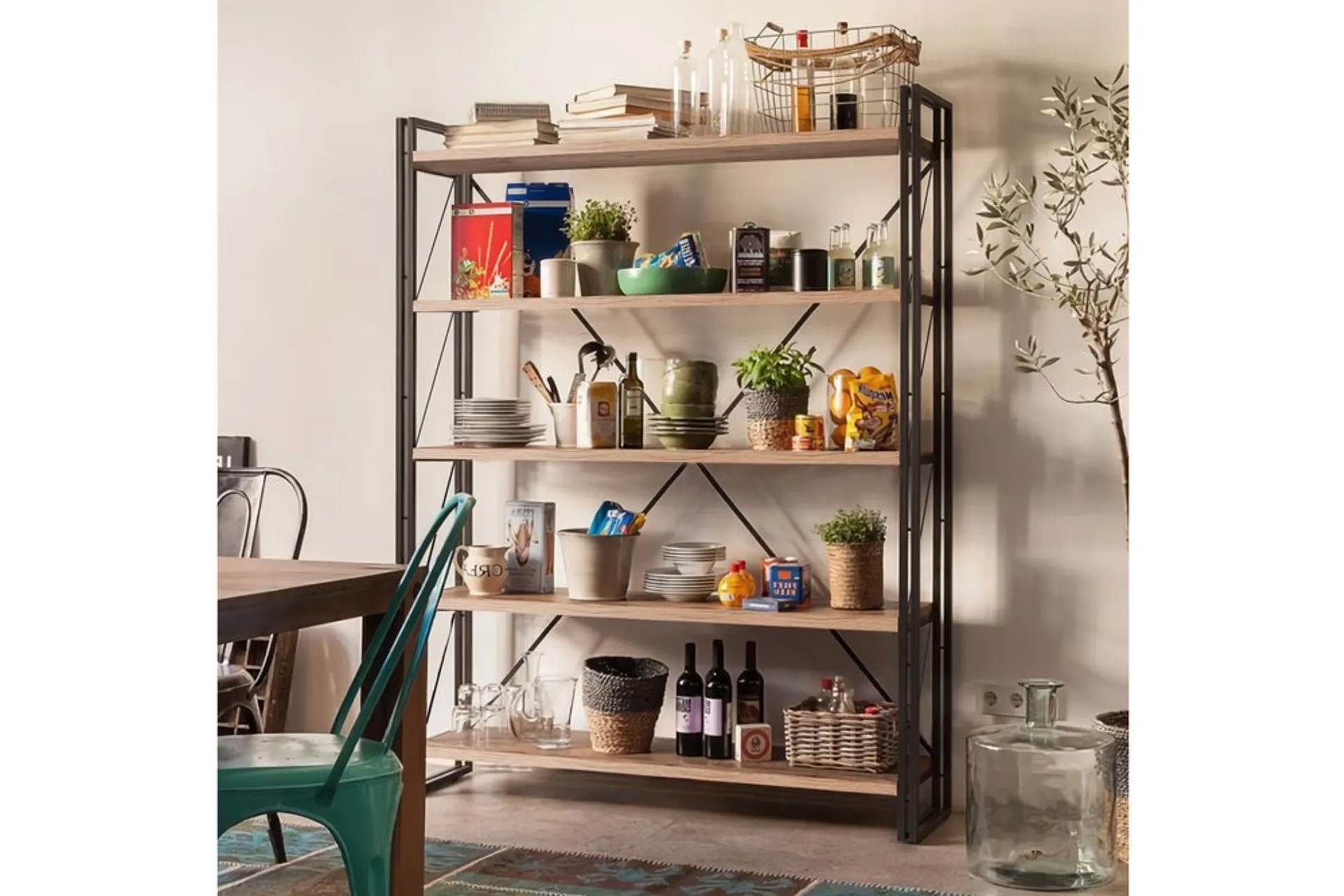 Bu ürün, endüstriyel tasarıma sahip bir kitaplık ve çalışma masası setidir.