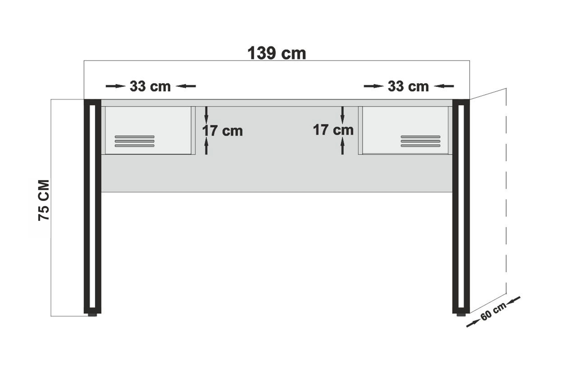 Cosmo Siesta Çalışma Masası: 139 cm genişlik, 60 cm derinlik, 75 cm yükseklik.