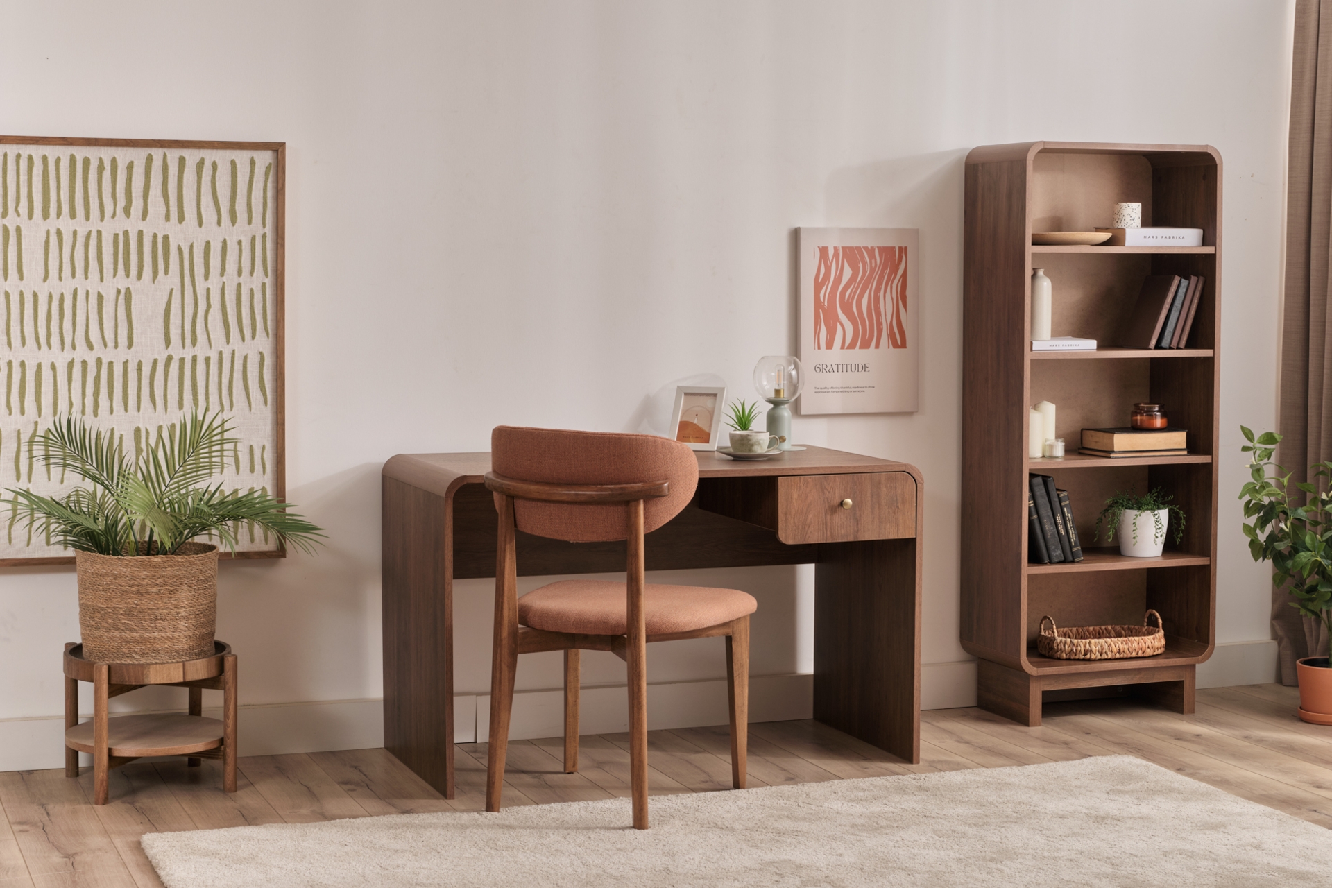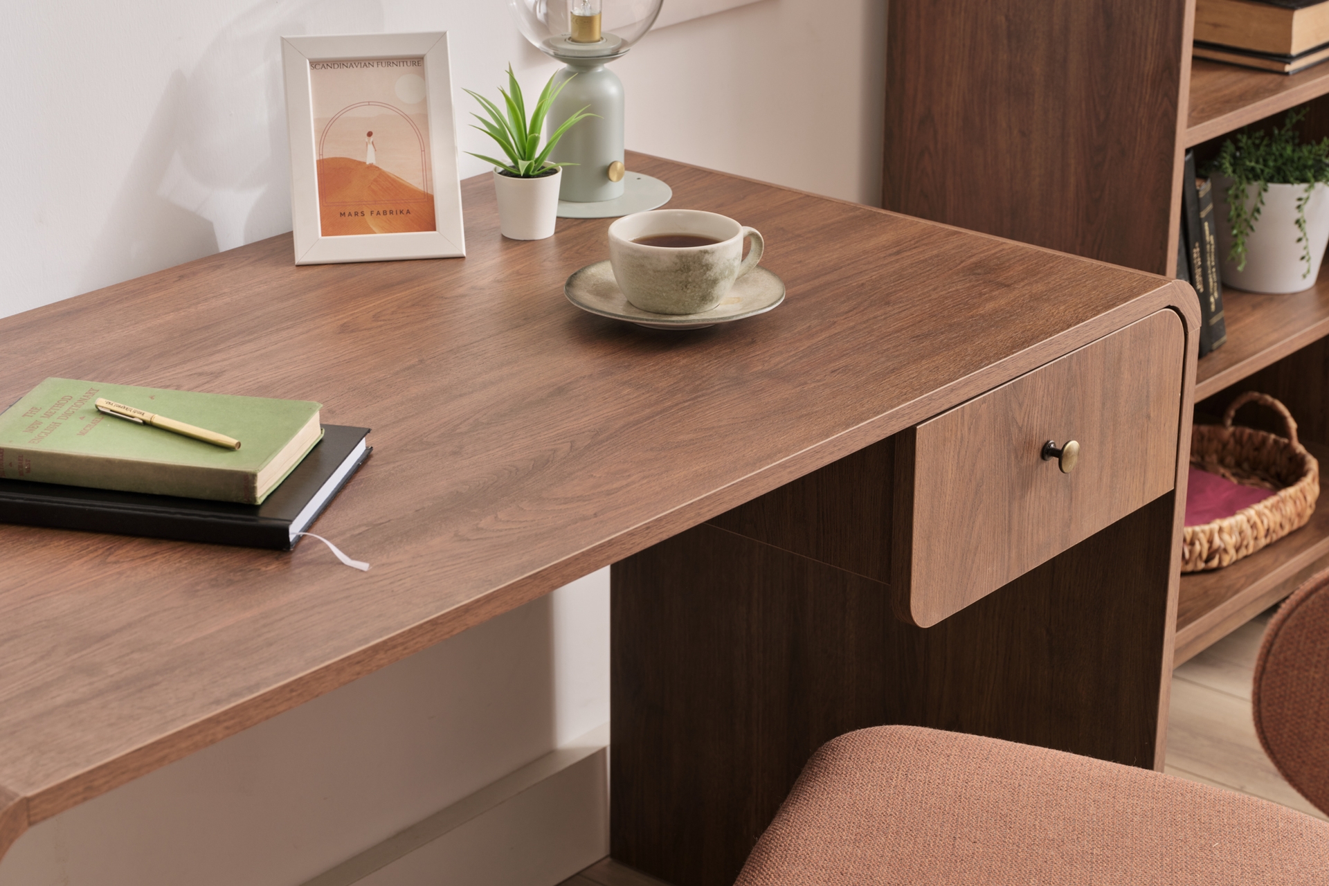Tasarım: Minimalist ve modern bir tasarıma sahiptir. Ceviz tonlarındaki ahşap dokusu, gold (altın) detaylı şık kulplarla tamamlanmıştır. İlk incelediğimiz Girona kitaplık ile aynı seriye aittir, bu nedenle bir çalışma alanı seti oluşturmak için mükemmel bir uyum sağlar.