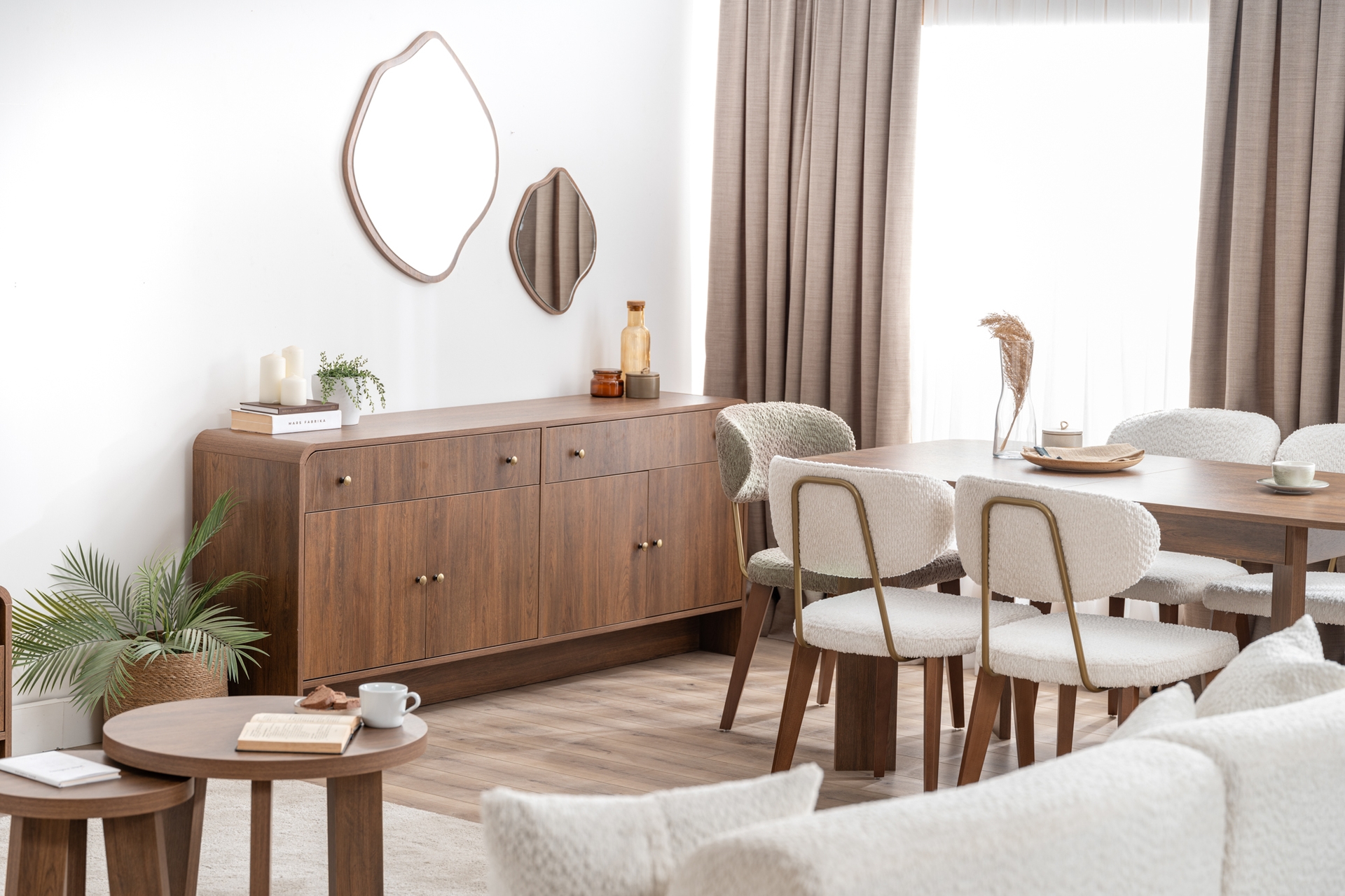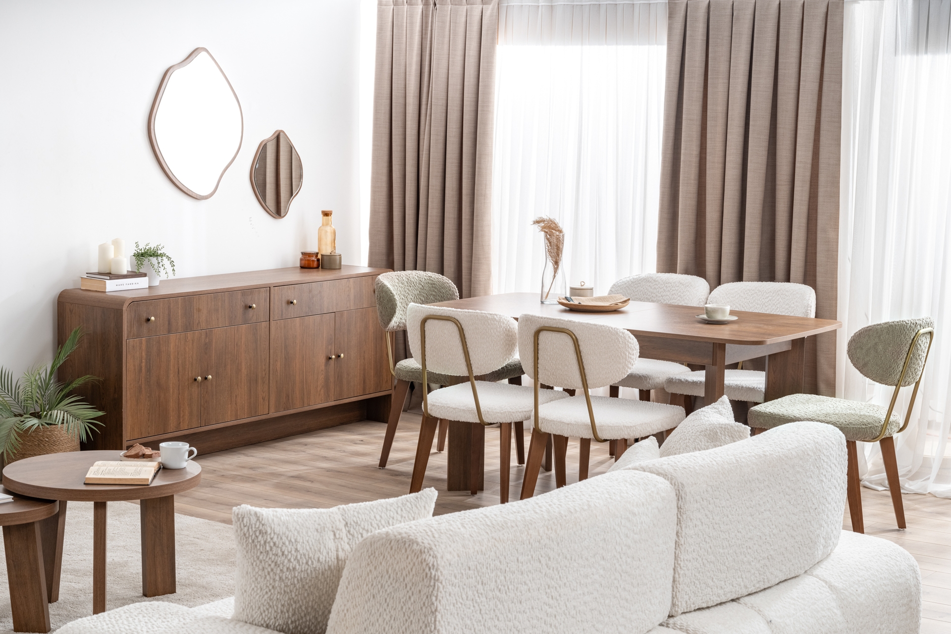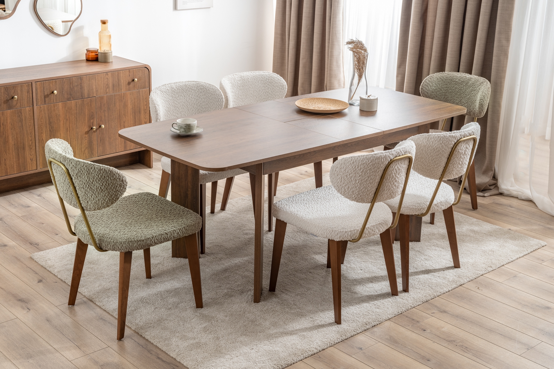 Girona Yemek Odası Takımı, modern ve klasik unsurları harmanlayan, oval köşe detaylarıyla öne çıkan şık bir settir.